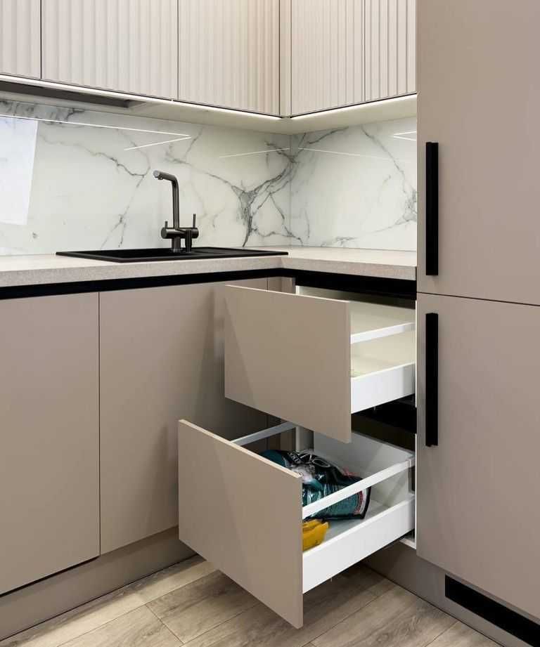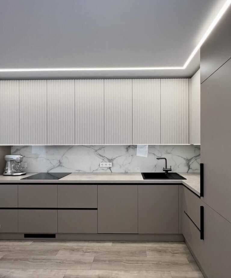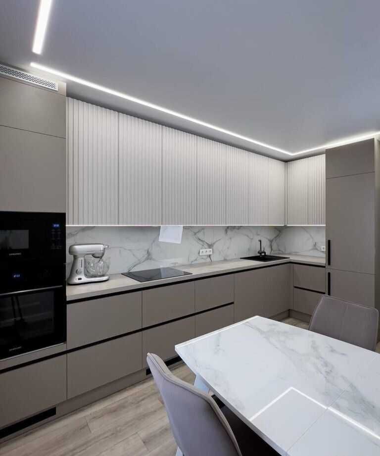 Фасады МДФ покрытые пленкой ПВХ,столешница искусственный камень.Открытии створок ( нижние секции) профиль Gola ( за фасад). Верхние створки открываются от нажатия. Ящики: метабоксы. Подсветка: врезной профиль. Стоимость - 68 000 за п/м.