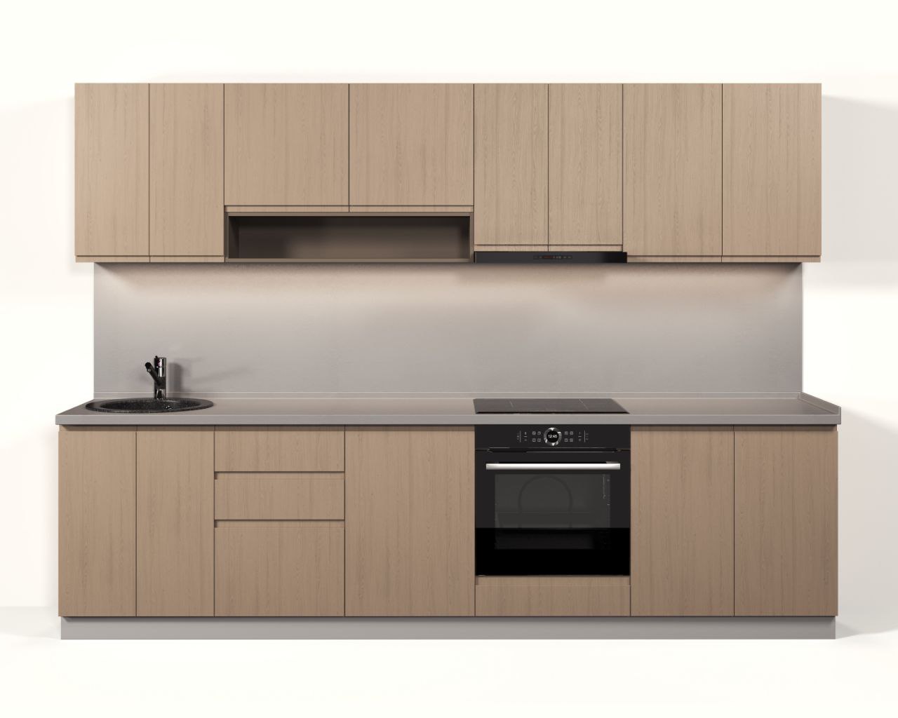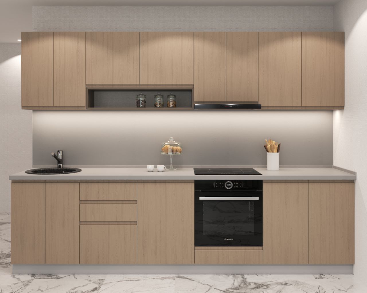 Кухонный гарнитур с фасадами из натурального шпона в Москве Фасады с интегрированной ручкой. Фасады низ МДФ в шпоне ясеня ( покрытие эмаль, лак) Фасады верх МДФ в шпоне ясеня. ( покрытие эмаль, лак) Изменение цвета возможно. Длину кухонного гарнитура 3200 мм. Изменение размеров возможно. Высота нижних модулей со столешницей 858 мм Высота верхних модулей 720 мм Столешница влагостойкая пластиковая 38 мм Петля накладная Prestige самозакрывающаяся. Направляющие скрытый монтаж L-450 с 3D регулировкой полного выдвижения для деревянных ящиков с доводчиком. Корпус ЛДСП. Рок изготовления 21-30 рабочих дней