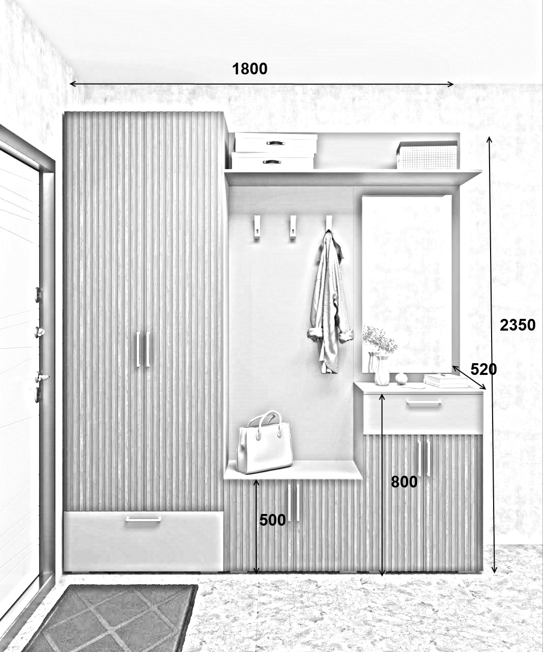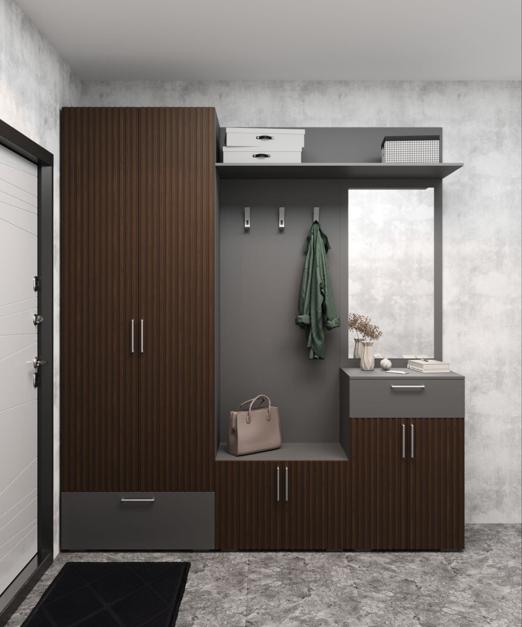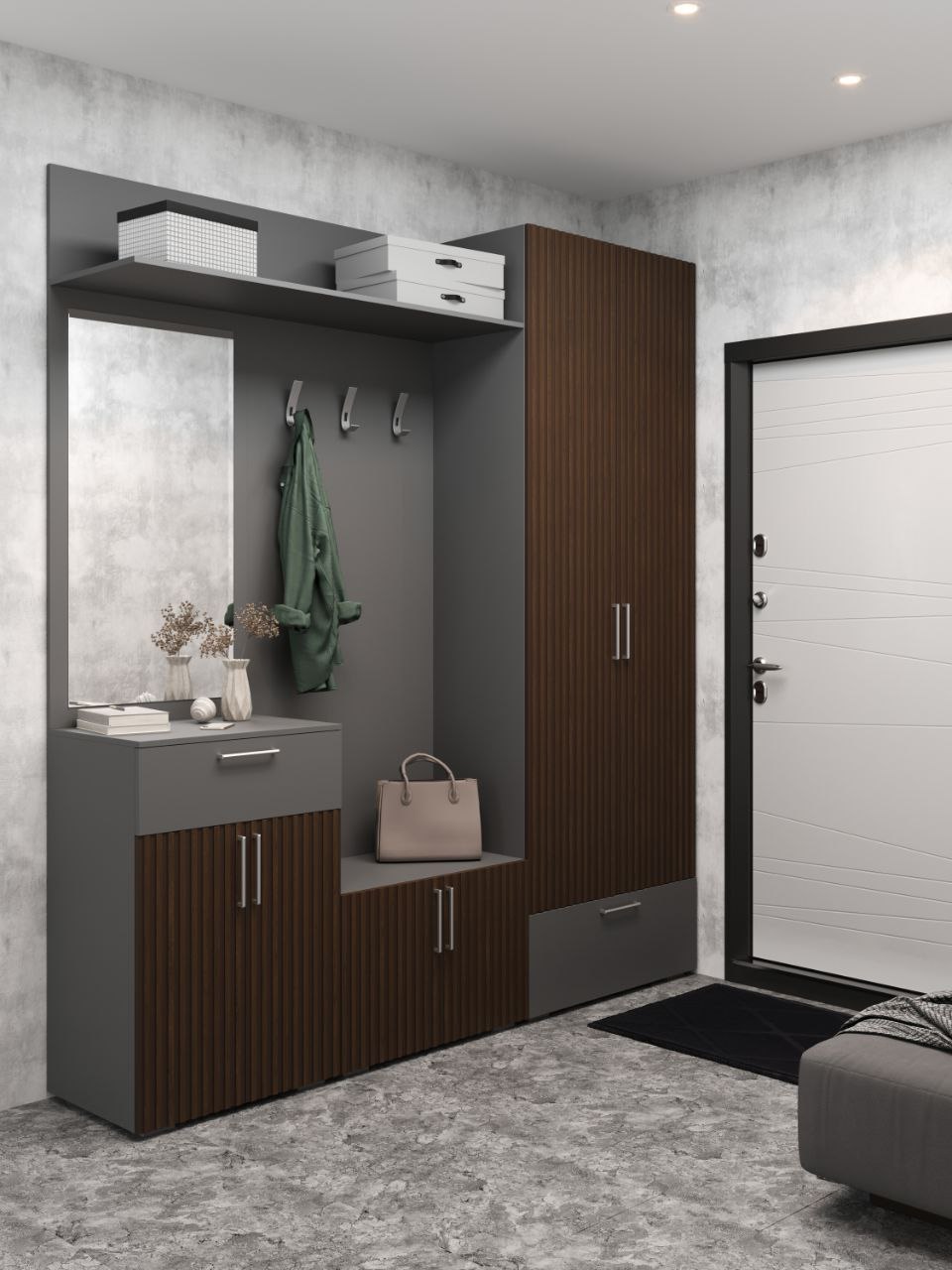 Мебель для прихожей в шпоне на заказ в Москве. Корпус и фасады выполнены из МДФ в шпоне. Ясень + дуб. Фурнитура AQ ( гарантия 10 лет). Срок изготовления 21-30 календарных дней. Стоимость изделия - 200 820 рублей