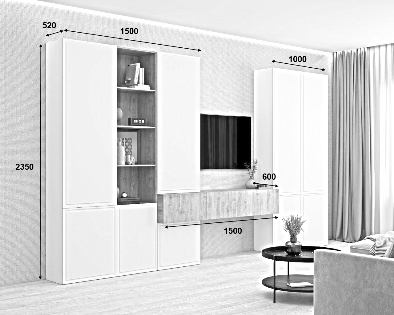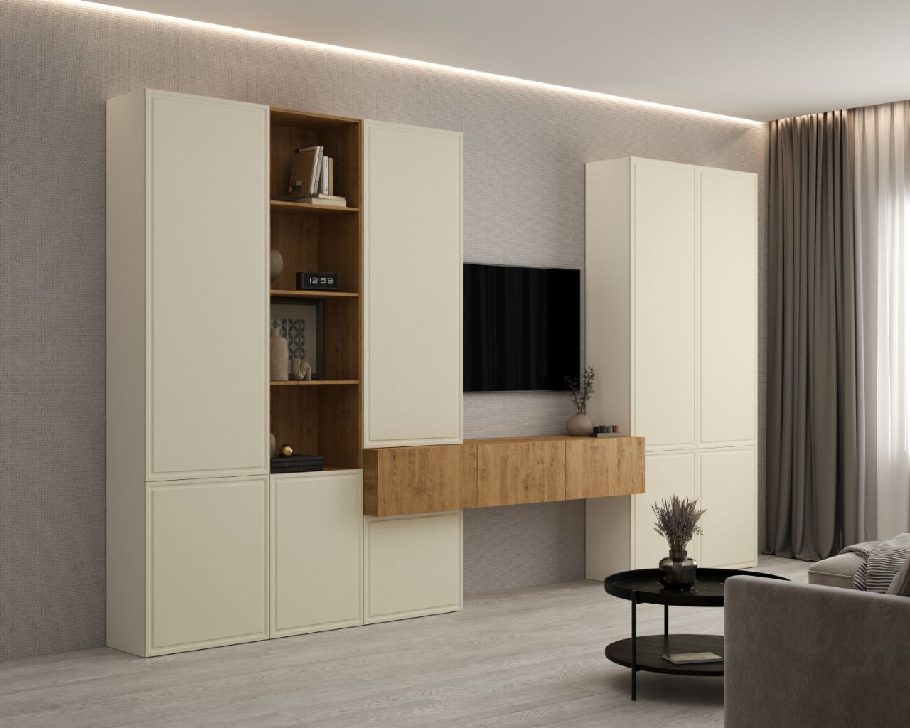 Мебель для гостиной в шпоне на заказ в Москве. Корпус и фасады выполнены из МДФ в шпоне. Ясень + дуб. Возможно два вида исполнения открытия створок. Открытие от нажатия и ручки. Срок изготовления 21-30 календарных дней. Стоимость изделия - 390500 рублей