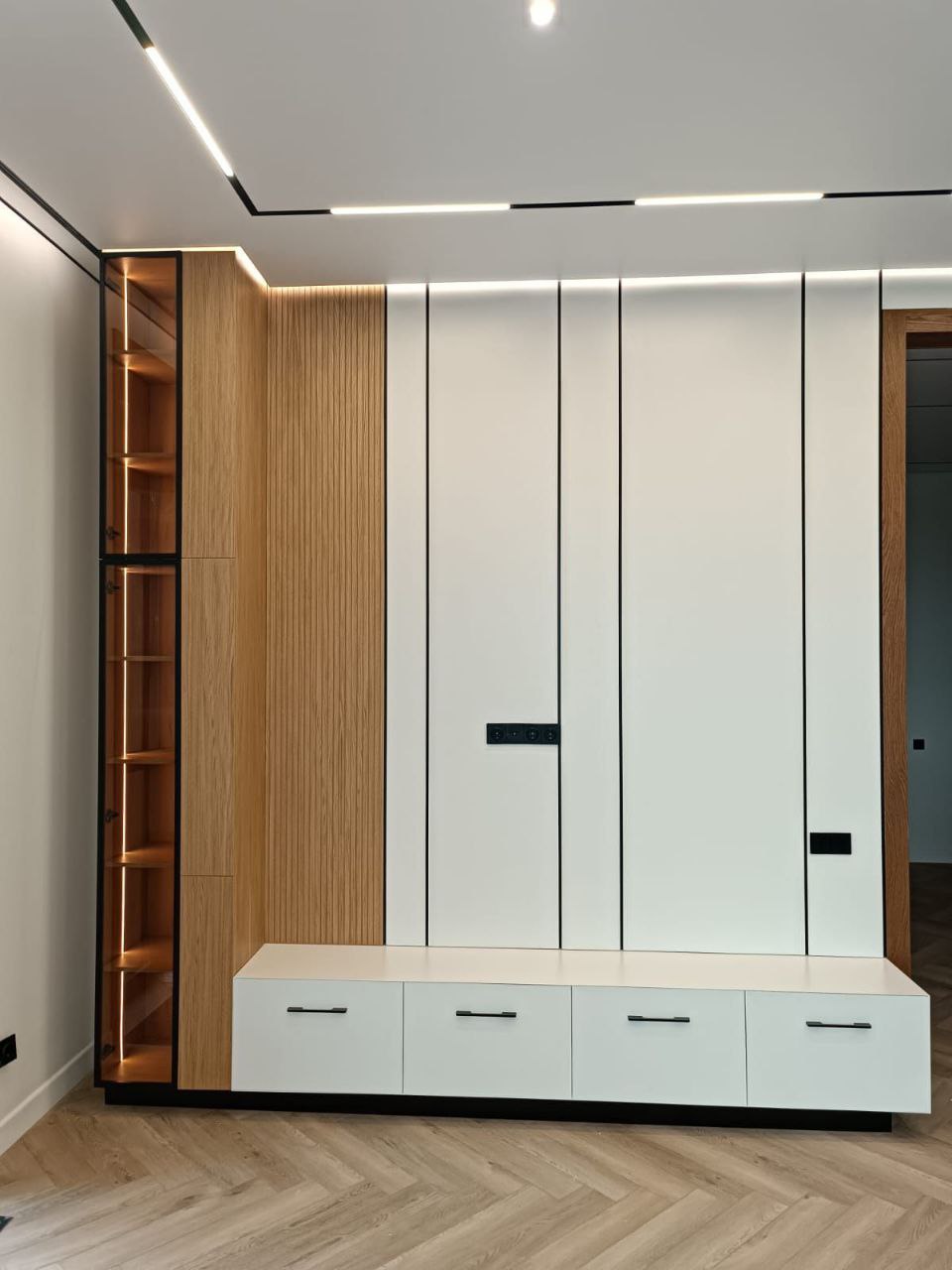 Набор мебели для гостиной. Тумба ТВ, корпус и фасады МДФ ( покрытие эмаль). Пенал, корпус и щит МДФ в шпоне ( покрытие лак). Створка стекло в алюминиевом профиле. Фурнитура AQ ( гарантия 10 лет). Срок изготовления 21-30 дней.