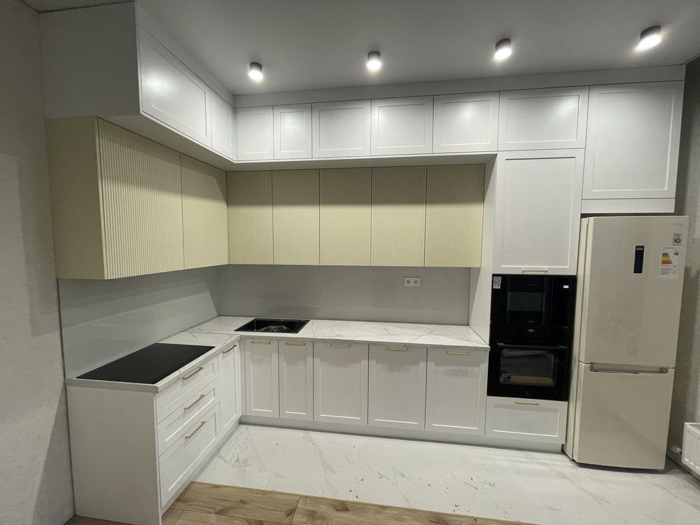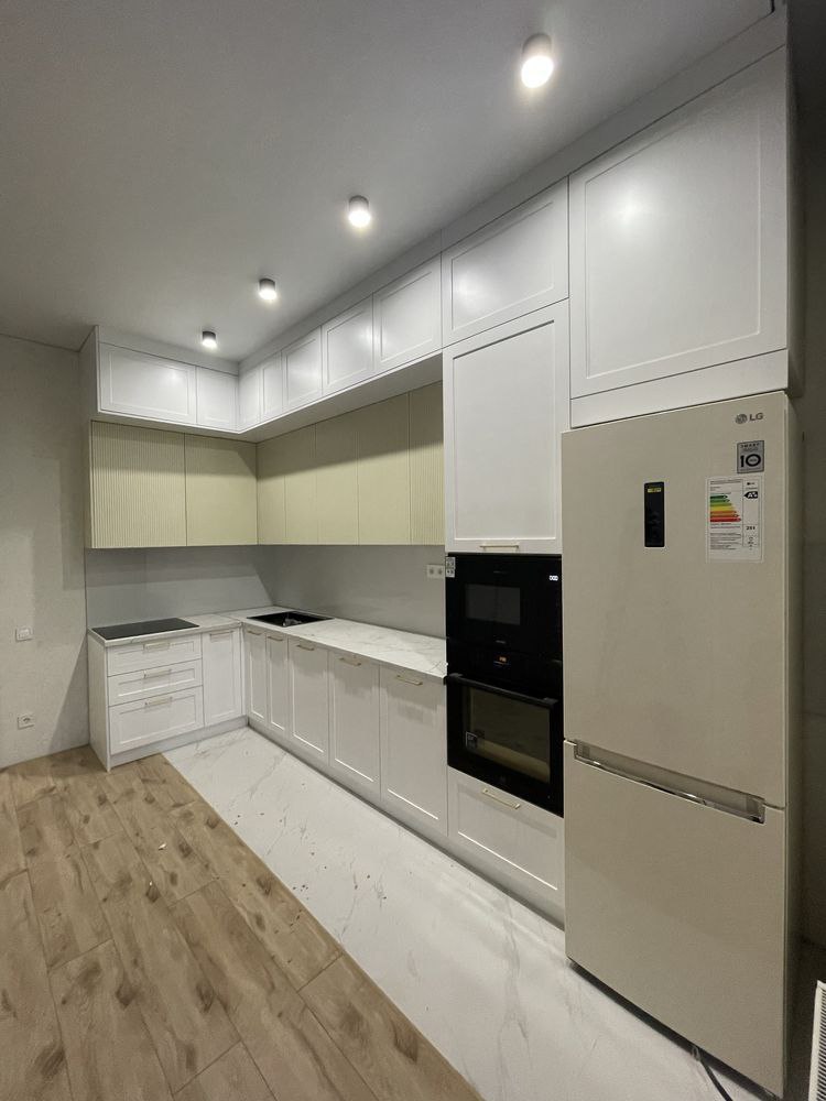 Угловая кухня на заказ в Москве от производителя. Фасады МДФ с фрезеровкой (покрытие эмаль). Корпус ЛДСП Egger,столешница пластиковая влагостойкая. Подсветка: врезной профиль. Фурнитура AQ (гарантия 10 лет). Срок изготовления 21-30 рабочих дней. Стоимость - 66 000 за погонный метр качественной кухни на заказ в Москве
