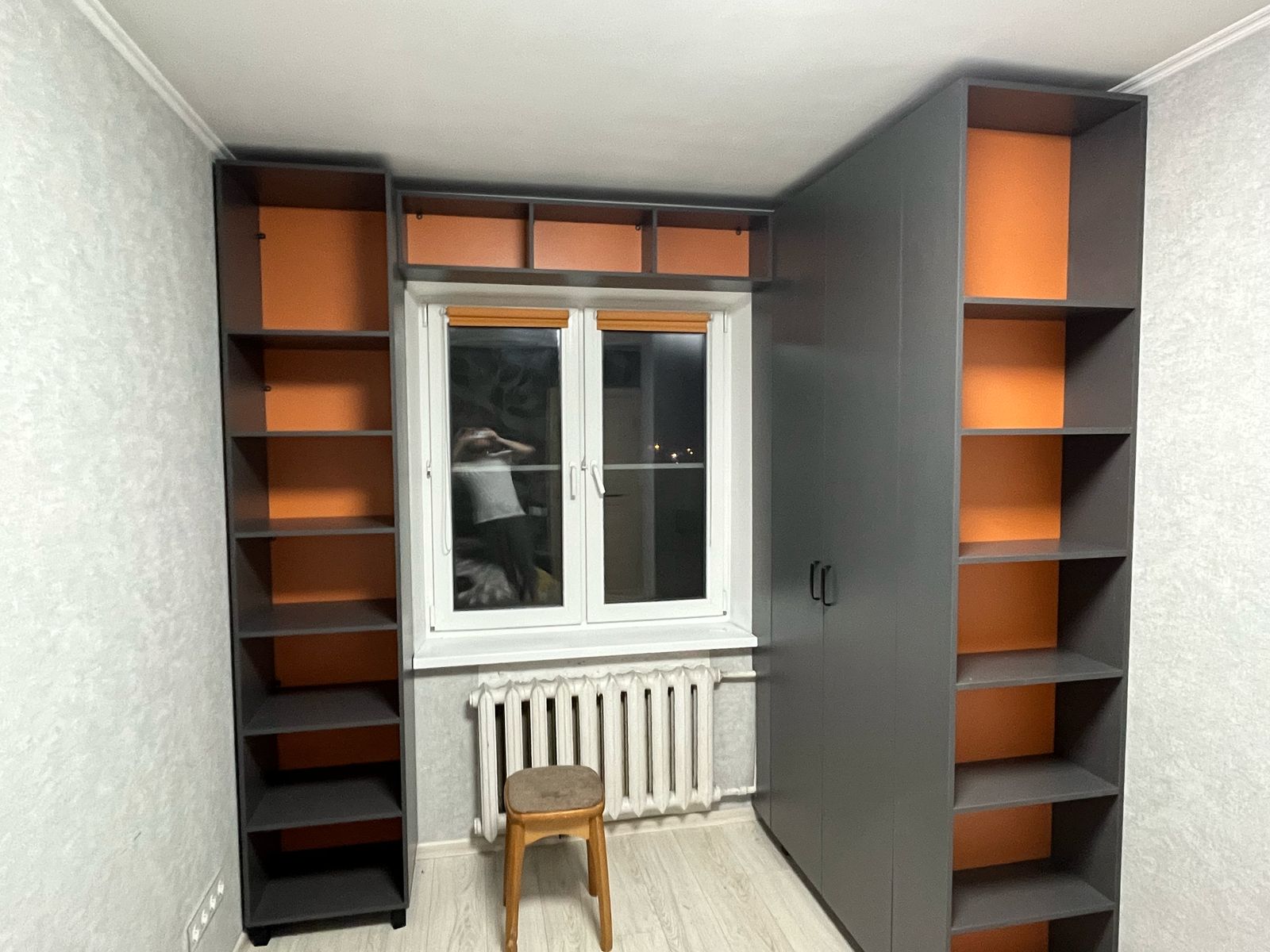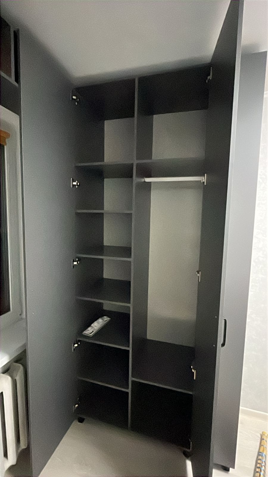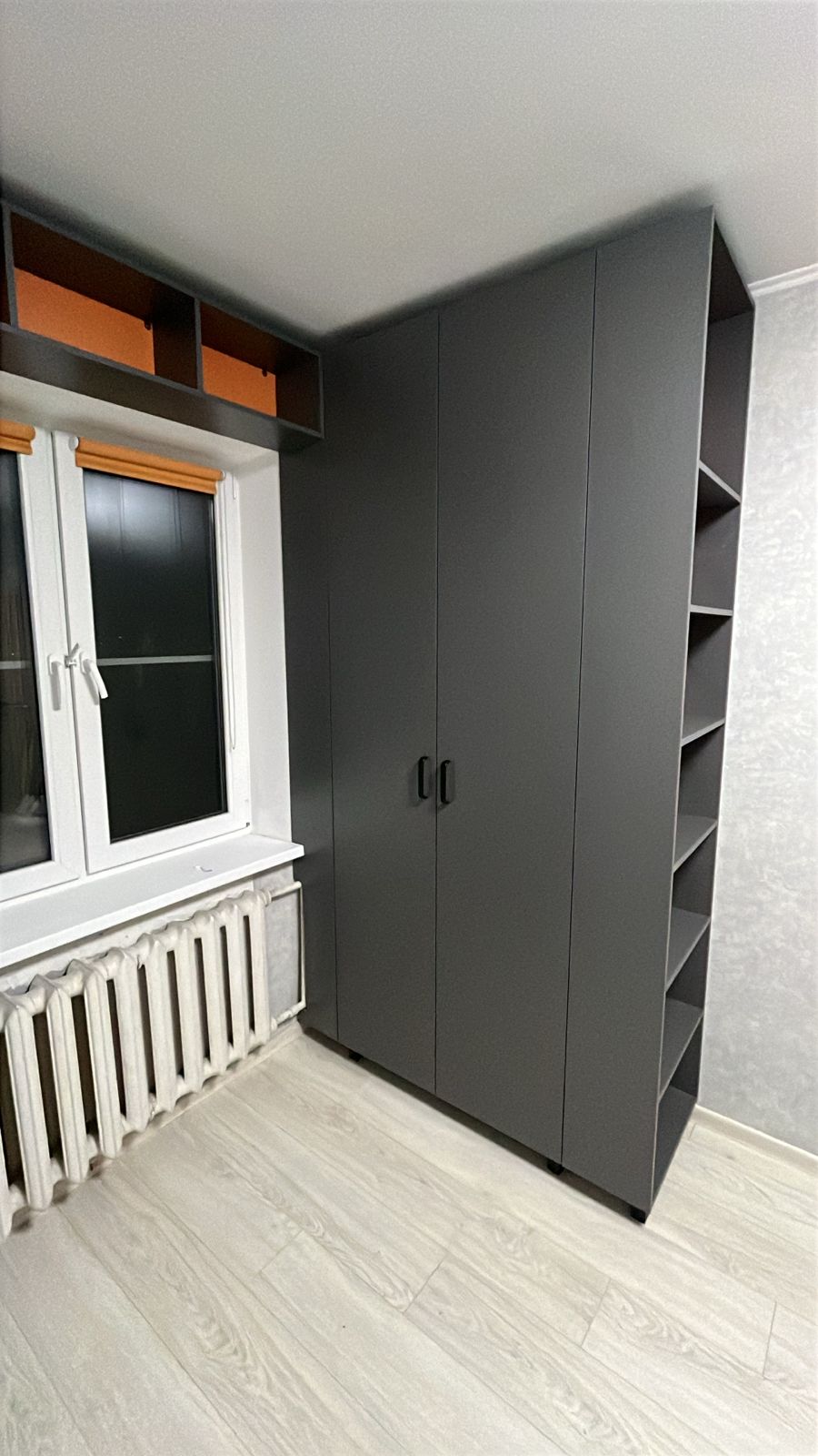 Распашной шкаф с пеналом и открытыми полками на заказ в Москве. Фасады и корпус выполнен из ЛДСП. Фурнитура AQ ( гарантия 10 лет). Срок изготовления 14-21 рабочий день.